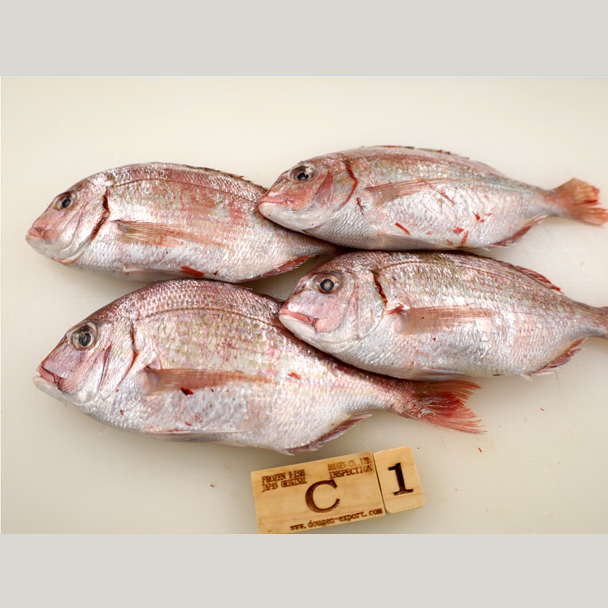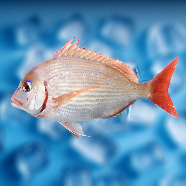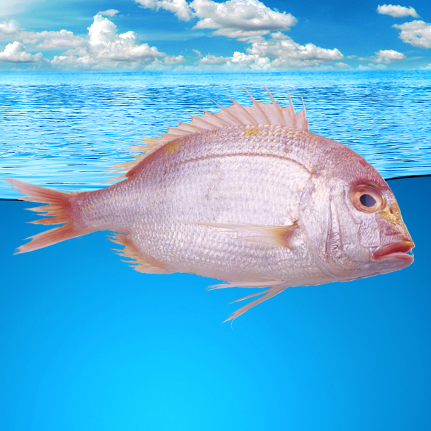 The blood sea bream (*Dentex hypselosomus*), a member of the Sparidae family, is commonly found in the waters around Japan, the East China Sea, and Taiwan. It is considered a premium fish species with significant economic value. The fish has a laterally compressed, oval-shaped body, with a coloration ranging from pale red to orange-red. Its back is slightly darker, the belly is silvery white, and both sides often show bluish or silvery iridescence. The skin is smooth, and the fins have a light purple hue. Its flesh has a reddish tint, which gives rise to the name "blood sea bream."